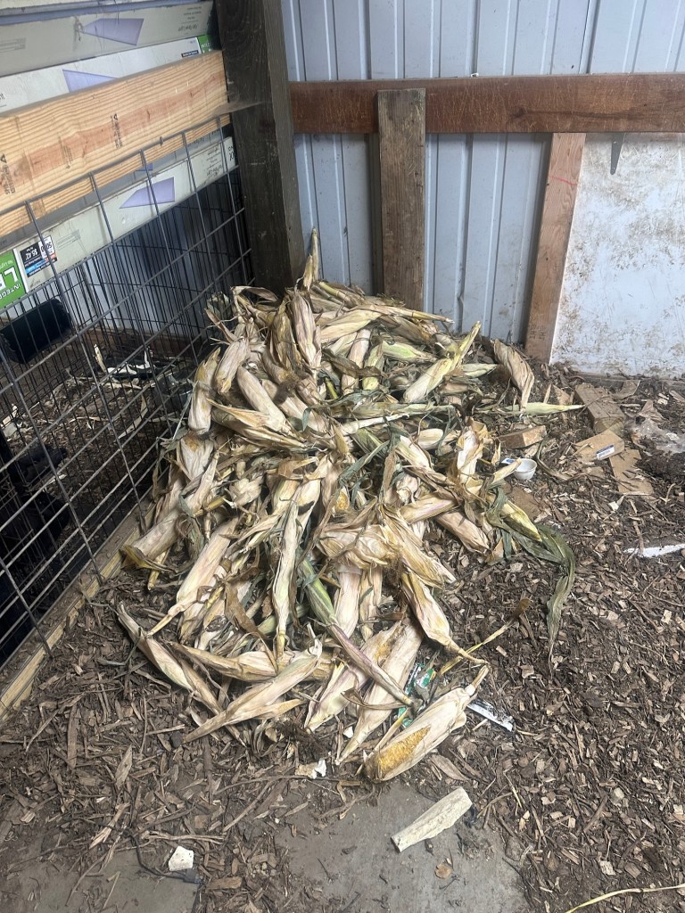 A huge part of how we keep costs low and nutrition high is through community partnerships. You might remember the story of Bob and his corn—well, here’s the pile of leftover corn that never made it to market. Instead of going to waste, it found a new purpose here at DaleWood Farms.