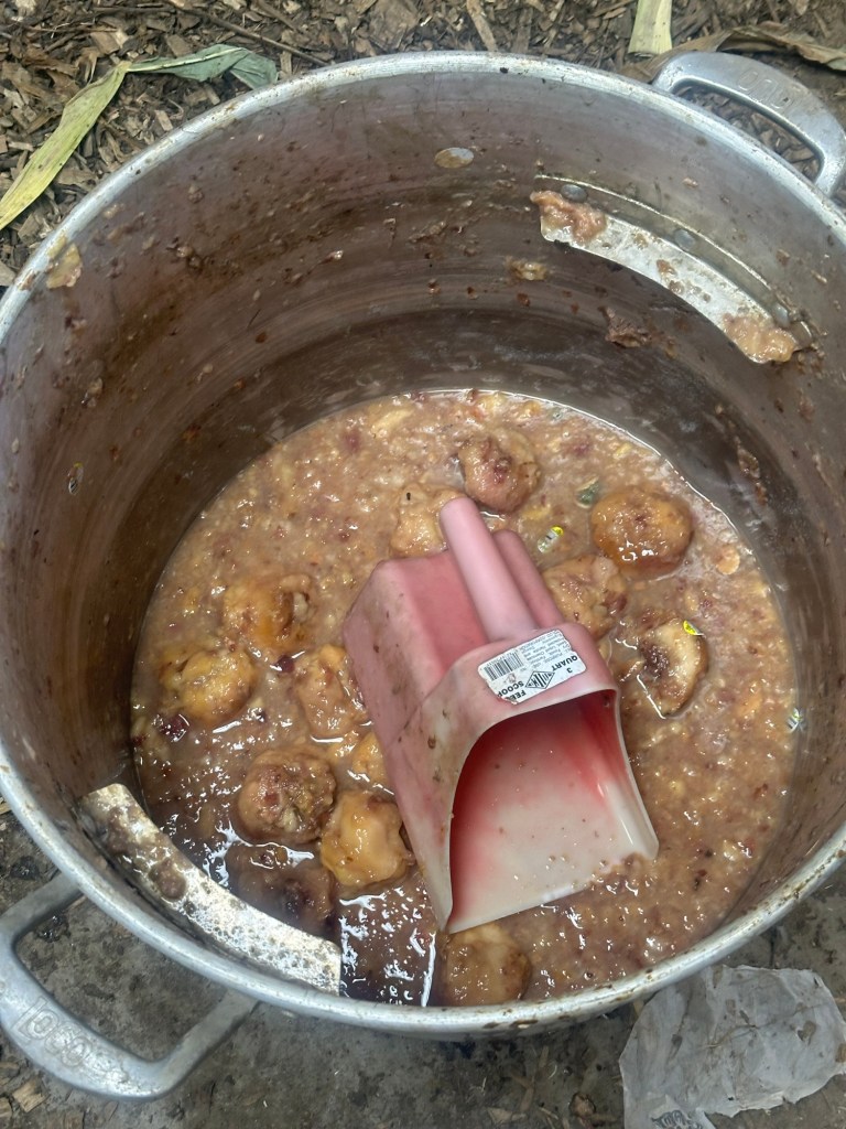 And then there are the nectarines. Our friends at Prairie Hills Farm in Selma, Indiana, had surplus fruit that couldn’t be sold. Instead of hitting the dumpster, those nectarines became part of our feed program. We mash them down into scoops of sweet, vitamin-packed pig feed.